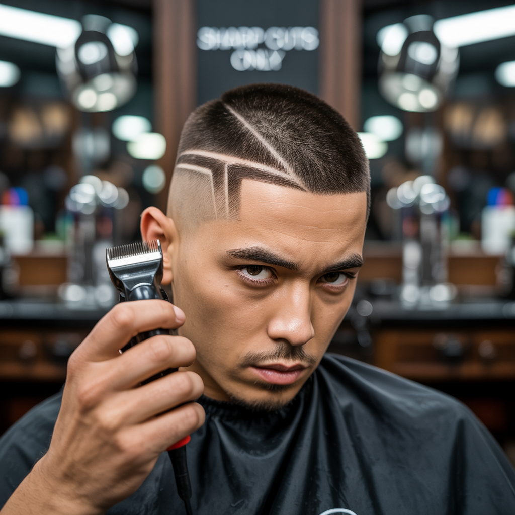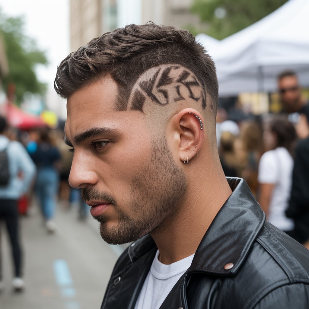 The ultimate statement: a designer fade with custom art, patterns, or logos. Best for those who want to own the spotlight at events and festivals. Visit a skilled barber and maintain with regular trims.
