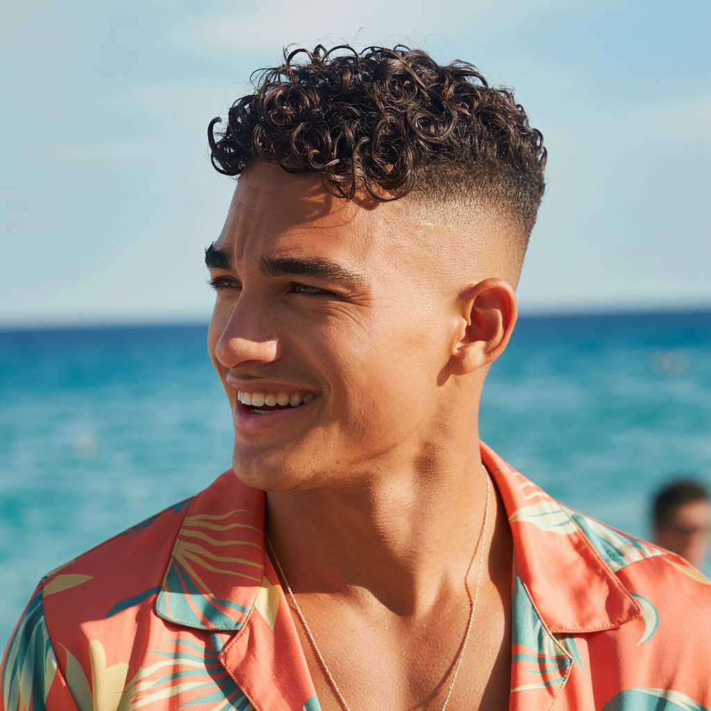 Keep curls defined and sides neat with a low fade. This look is playful and youthful, ideal for spring and summer. Use a curl activator for best results.