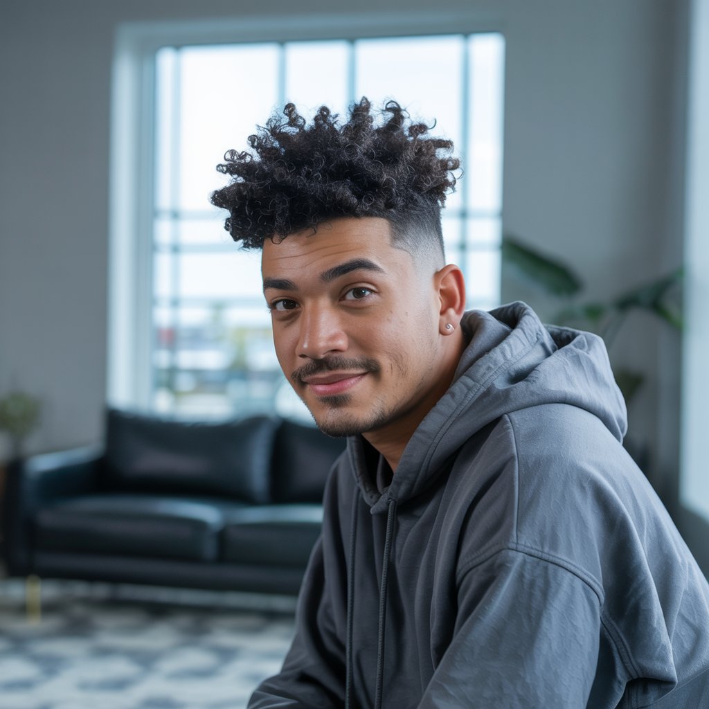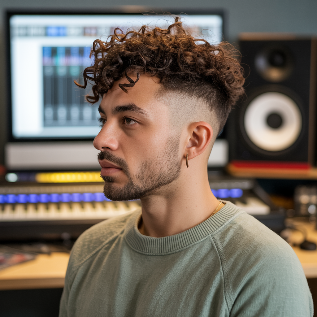 Let your curls take center stage with a fade that highlights volume on top. This style is perfect for oval and heart-shaped faces, and it’s a favorite among artists and musicians. Use curl cream for bounce and definition.
