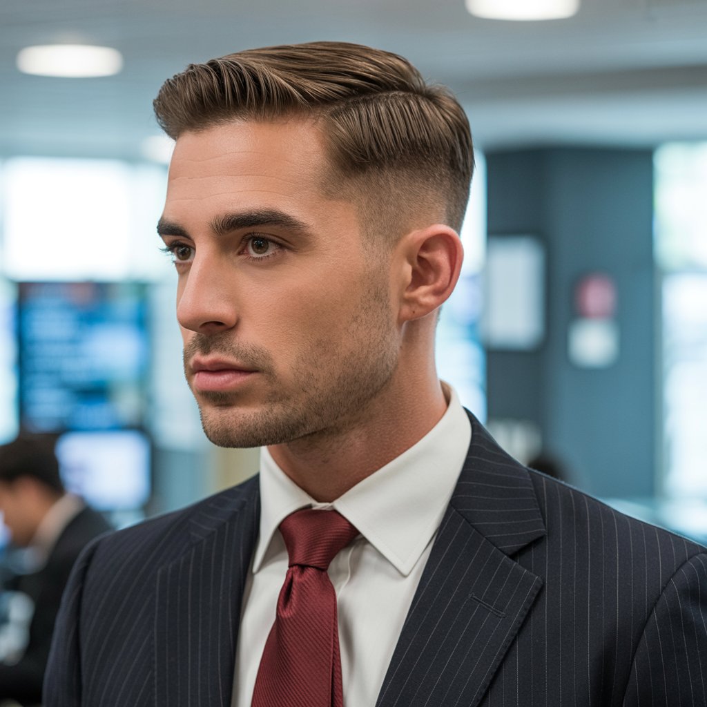 The shadow fade creates a soft, gradual transition for a natural, blended look. Perfect for all hair types and conservative workplaces. Use a light styling cream for subtle shine.