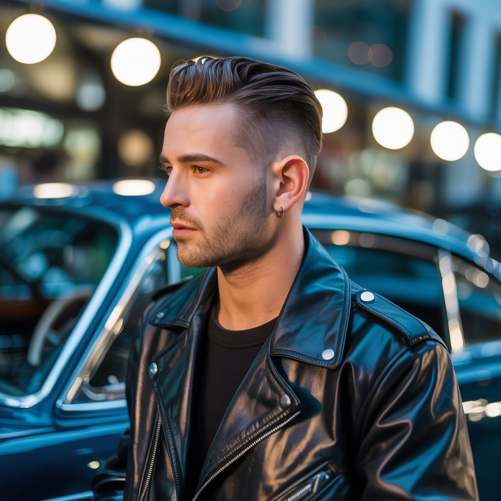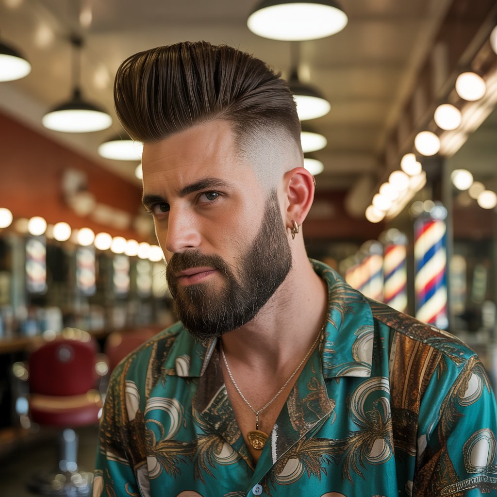 The pompadour fade brings vintage vibes into 2025. Ideal for confident men and special occasions. Style with a volumizing mousse and a wide-tooth comb.