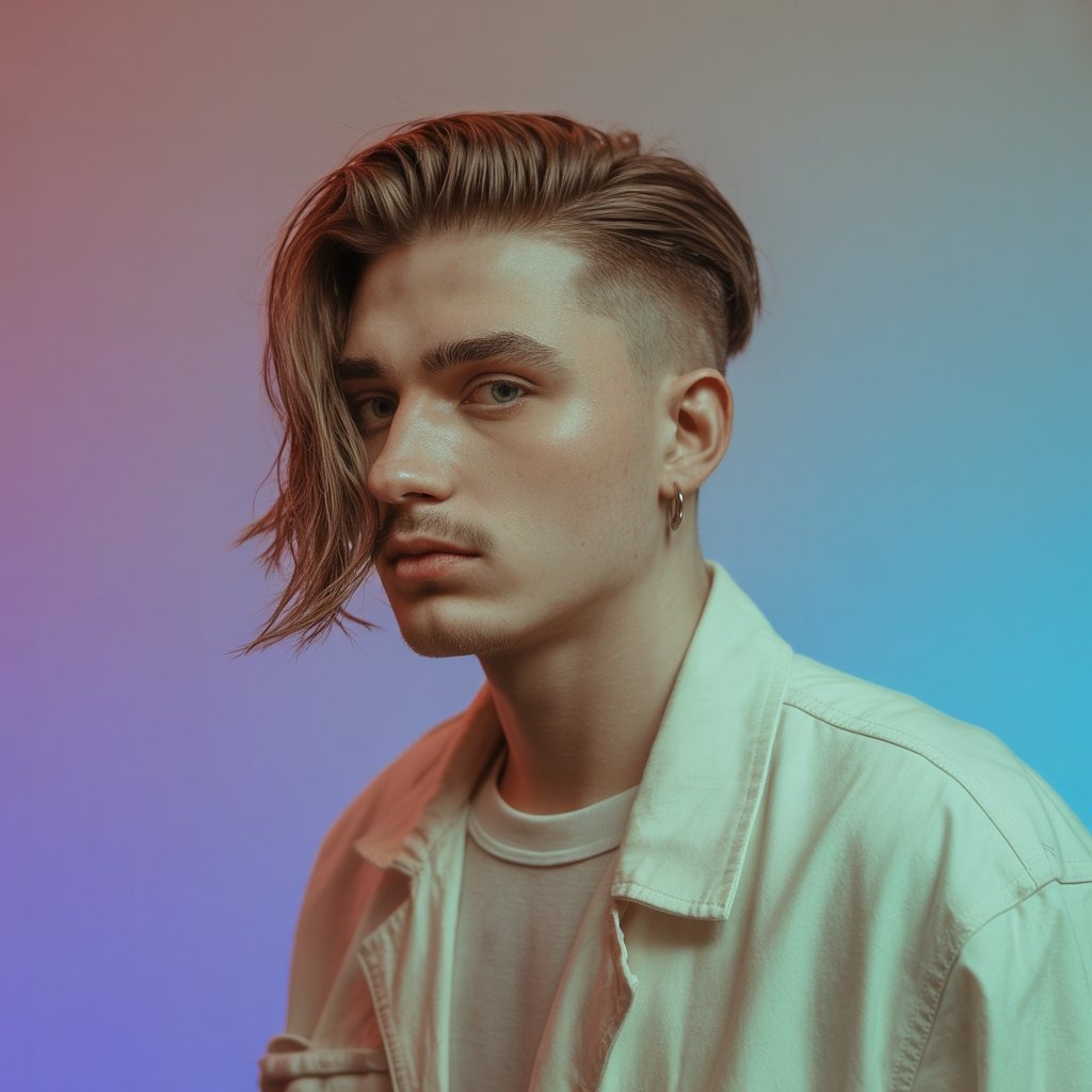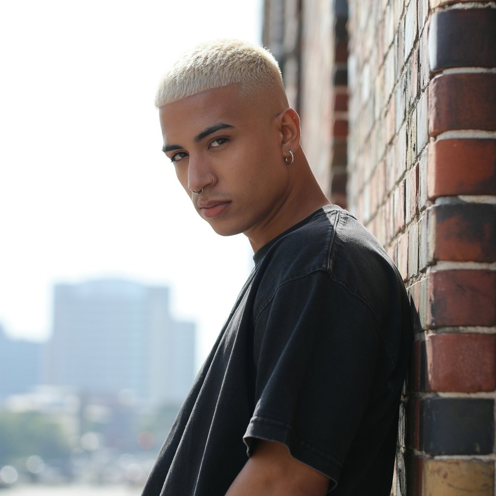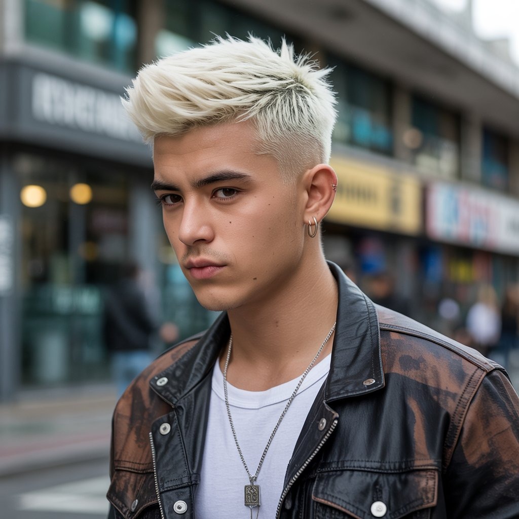 2025’s rebel move—bleached top, clean faded sides. Best for men into bold streetwear and TikTok style. Keep color vibrant with toning treatments and UV protection.