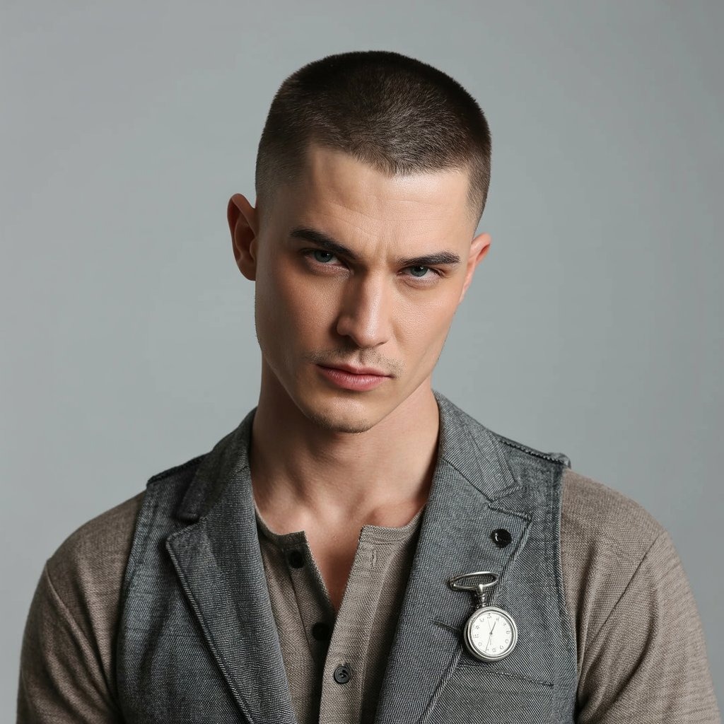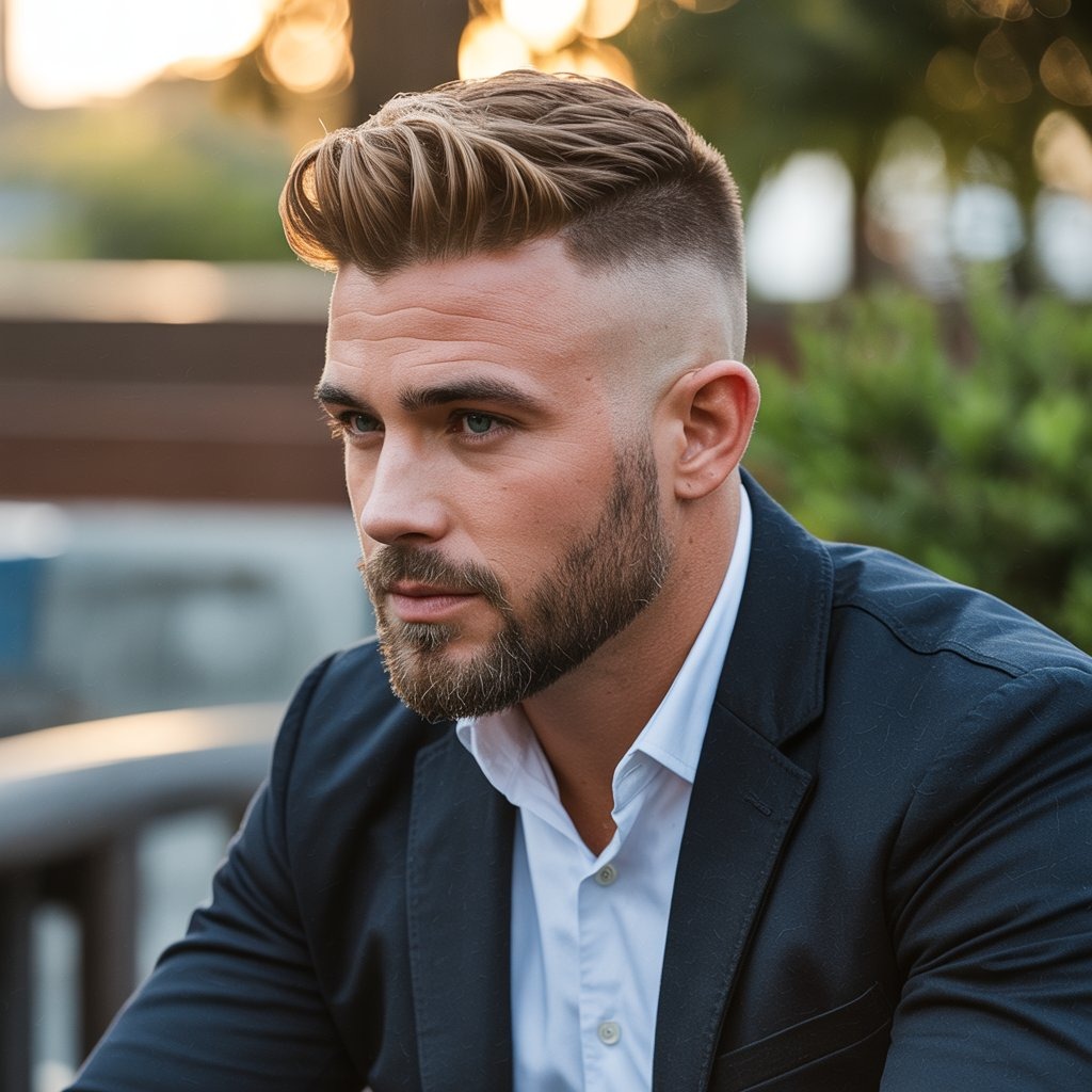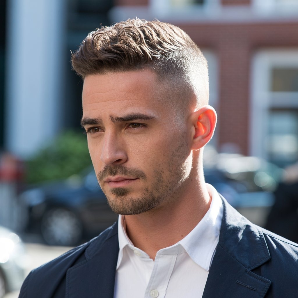 The cleanest of all: a buzz cut with a high skin fade delivers military precision. Ideal for oval or square faces and warmer seasons. It demands minimal upkeep but benefits from scalp care for a healthy finish.
