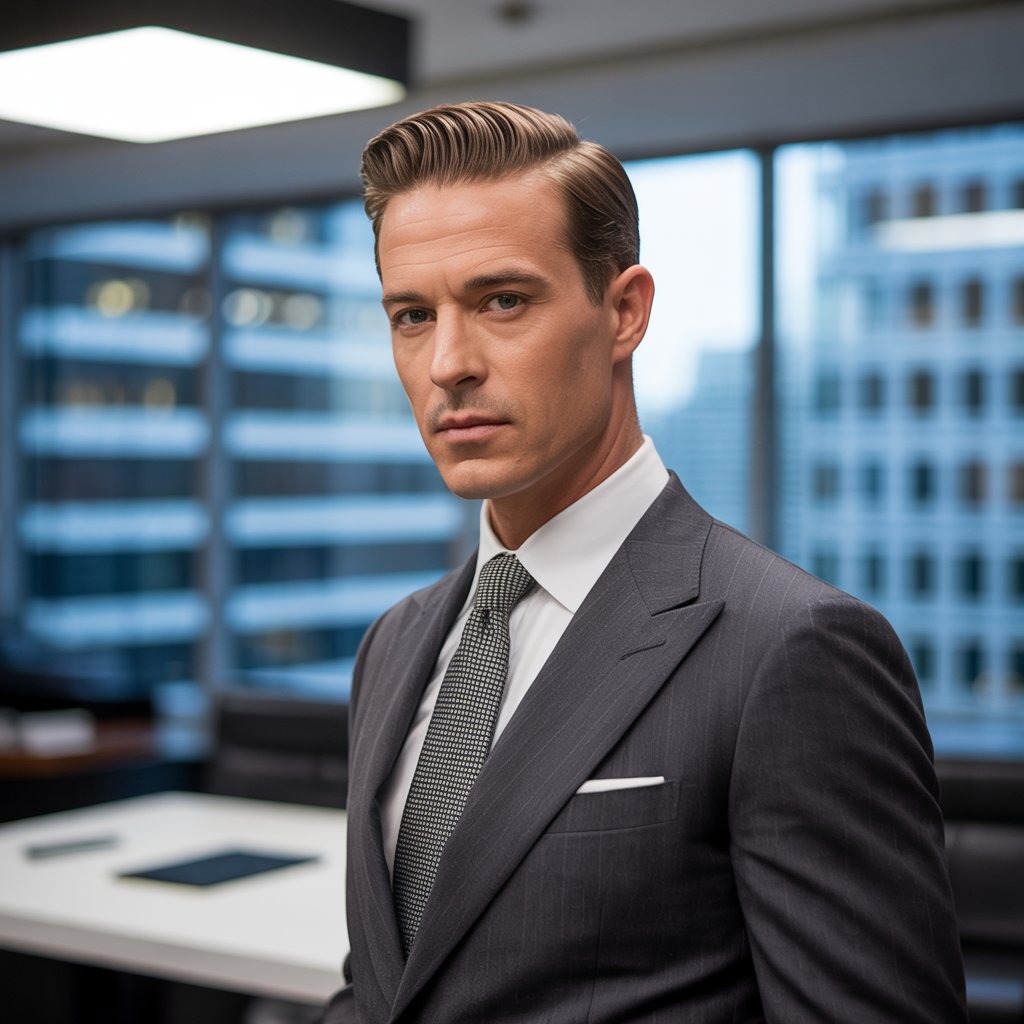 This elevated Ivy League cut blends refinement and edge. Great for professionals and creatives alike, especially with straight-to-wavy hair. Use light cream for a touchable finish.