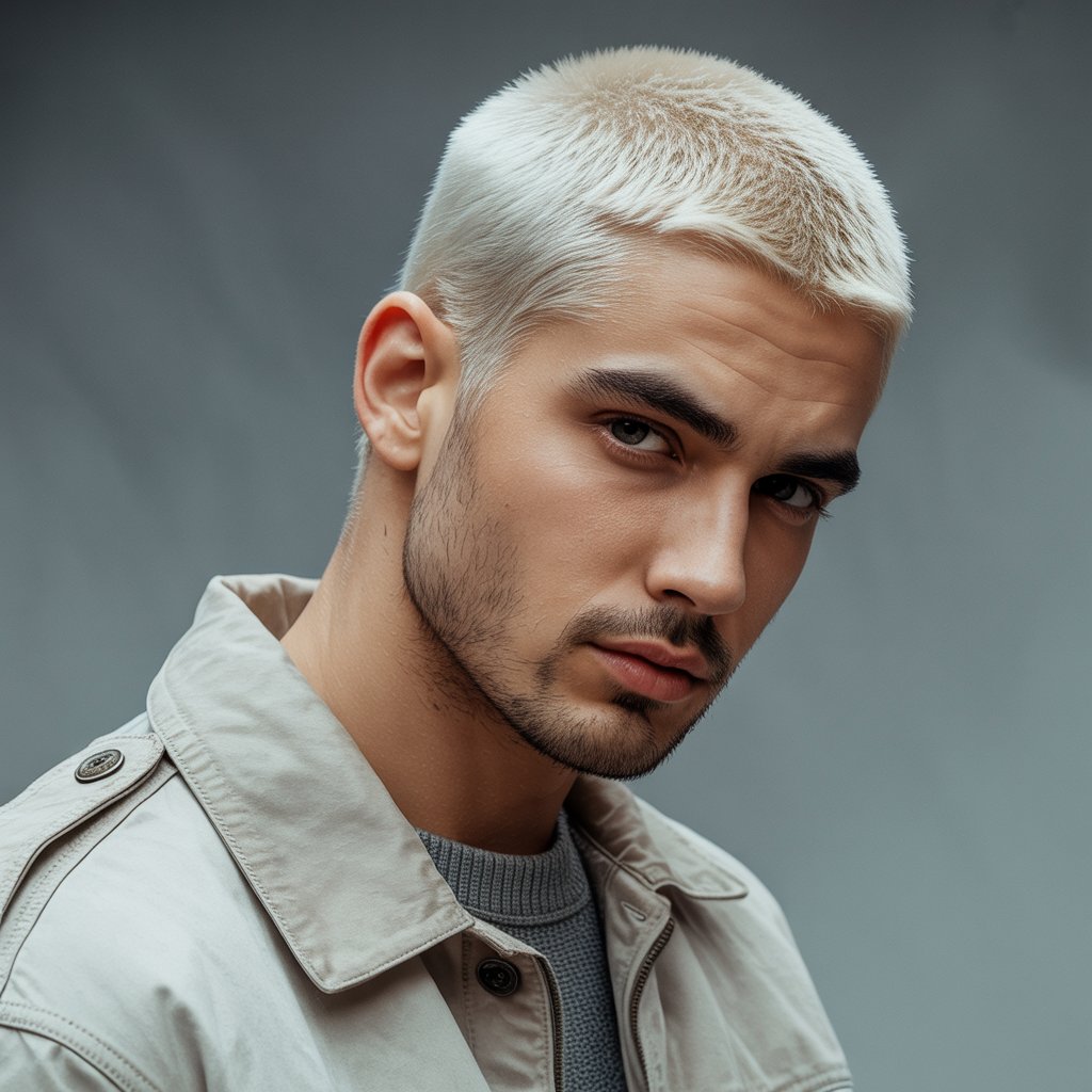Go bold with a platinum blonde crew cut. This icy hue is high-fashion and eye-catching. Use purple shampoo to maintain vibrancy.