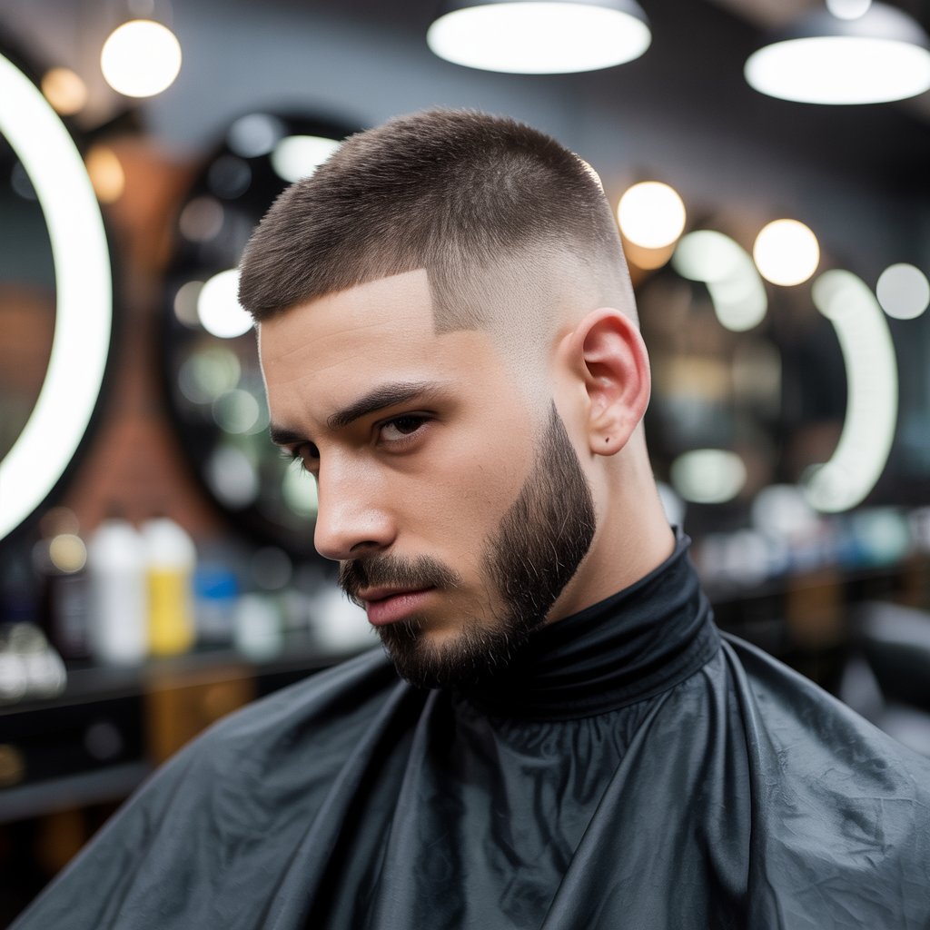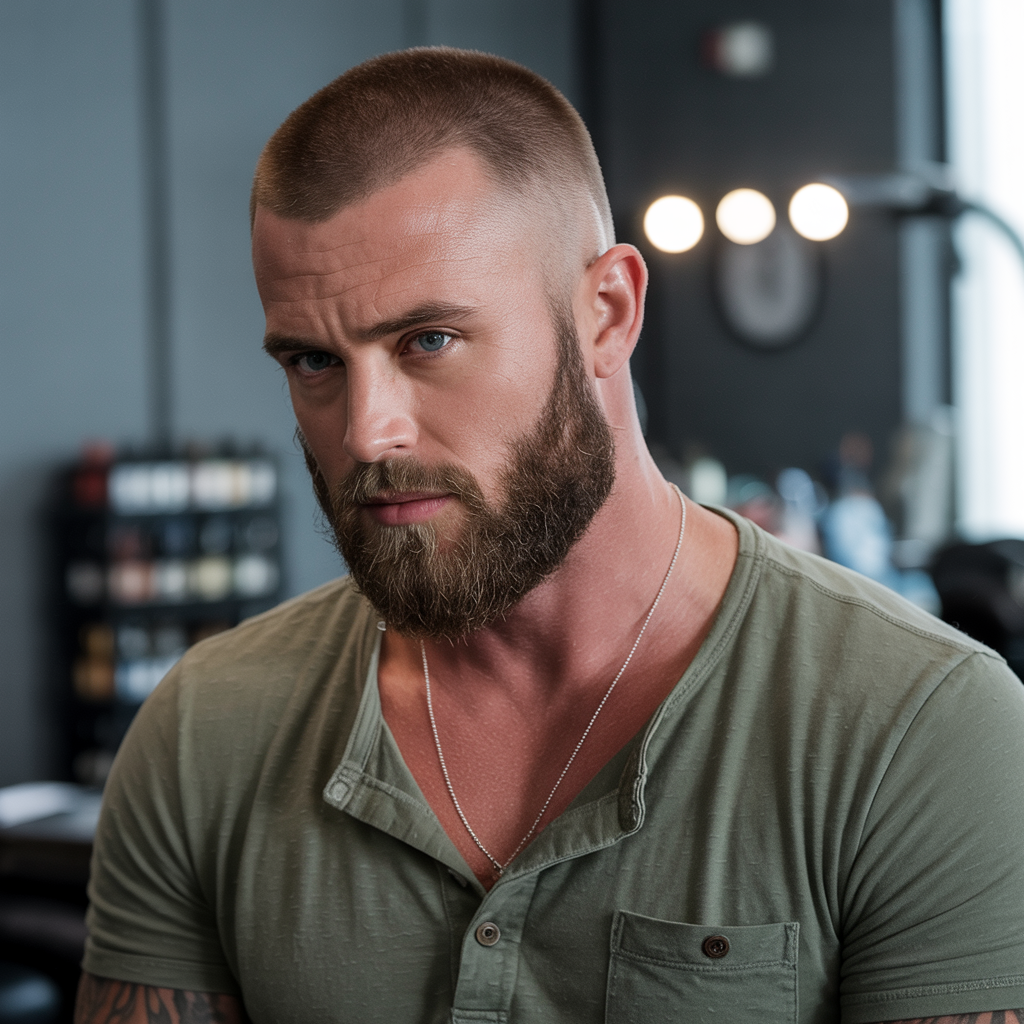 Pair a buzz cut with a full, shaped beard for a rugged, masculine look. Ideal for oval, square, and diamond face shapes. Use beard oil and a fade brush for grooming.