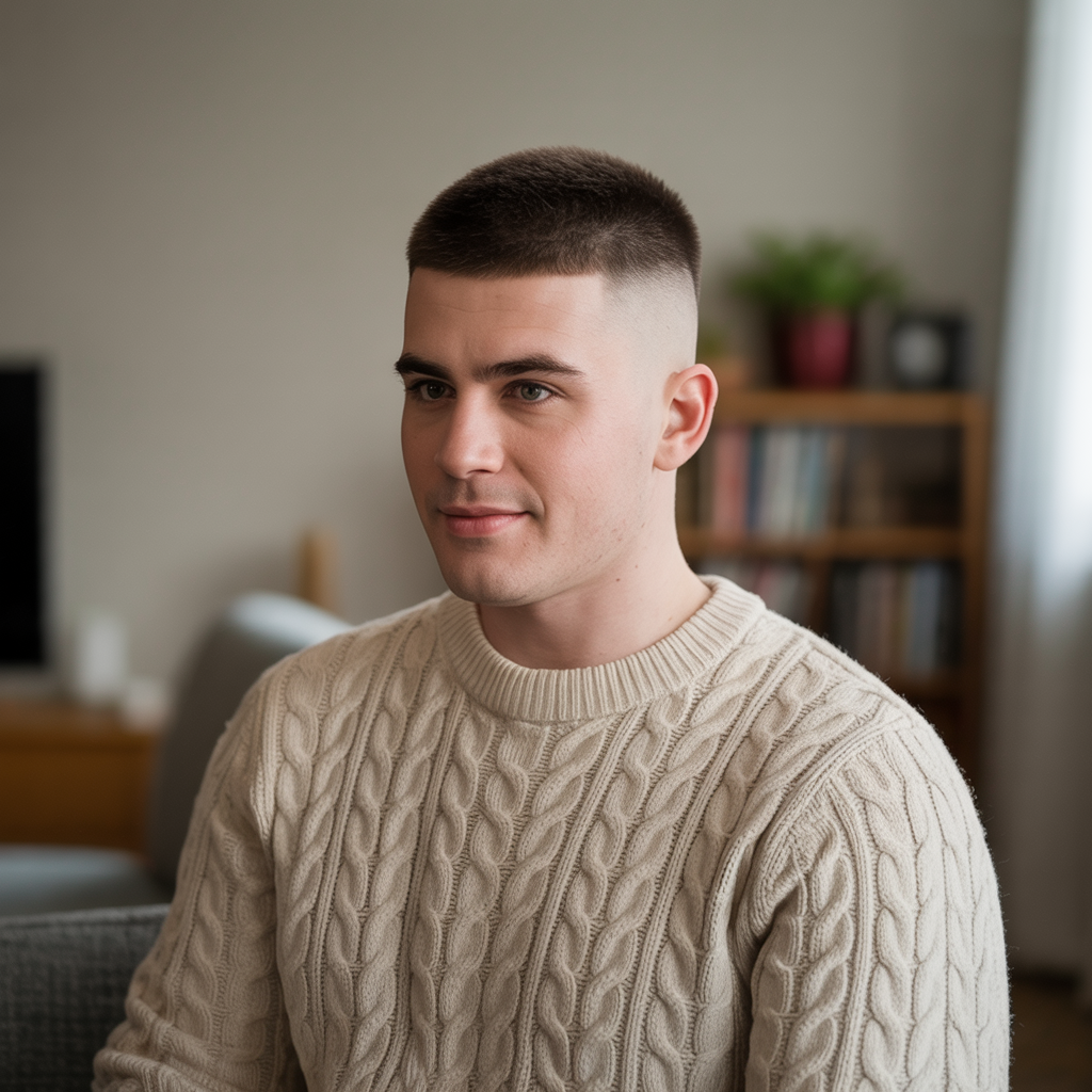 A subtle fade just above the ears gives this buzz a softer edge. Great for round and heart-shaped faces. Works well for office settings and casual weekends. Maintain with regular trims.